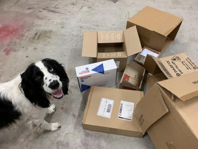 Scatter a collection of different sized boxes in an open area and hide your dog’s food amongst the boxes. For dog enrichment beginners, place the food where it is easy for the dog to see and reach (like at the top of the box). As your dog gets more advanced, you can start hiding the food inside the boxes and piling boxes on top of each other.