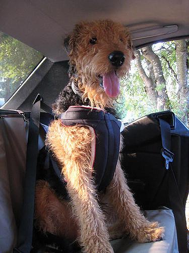 This Airedale Terrier is securely fastened. Right! Off to the woods!